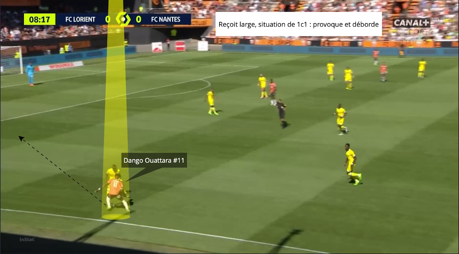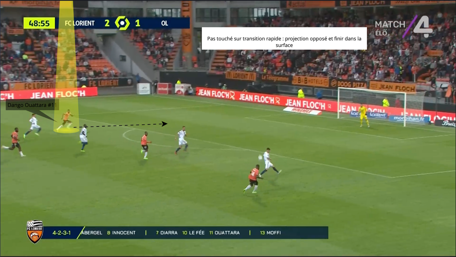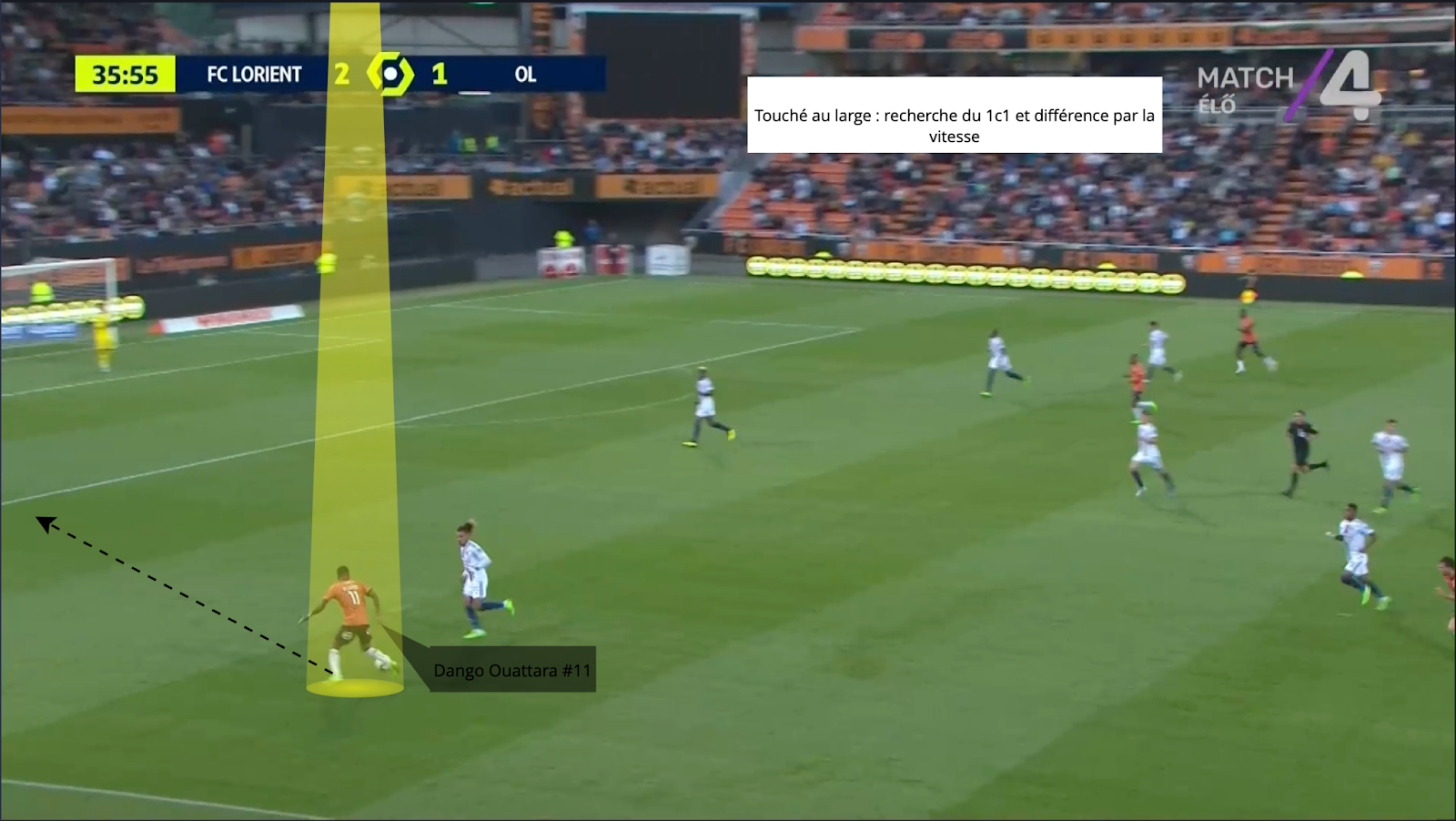 En esta situación, Dango Ouattara también es formidable. Más que su fina calidad de regate, es su explosión de velocidad y aceleración en los primeros 3 metros lo que marca aquí. El joven extremo de Lorient se adelanta muy rápido y lee muy bien los apoyos del oponente para atacarlo rápidamente cuando cambia la posición de su cuerpo. Tanto zurdos como diestros, la amenaza de meterse en el hueco es real, como hemos visto, lo que complica un poco más la tarea defensiva.
