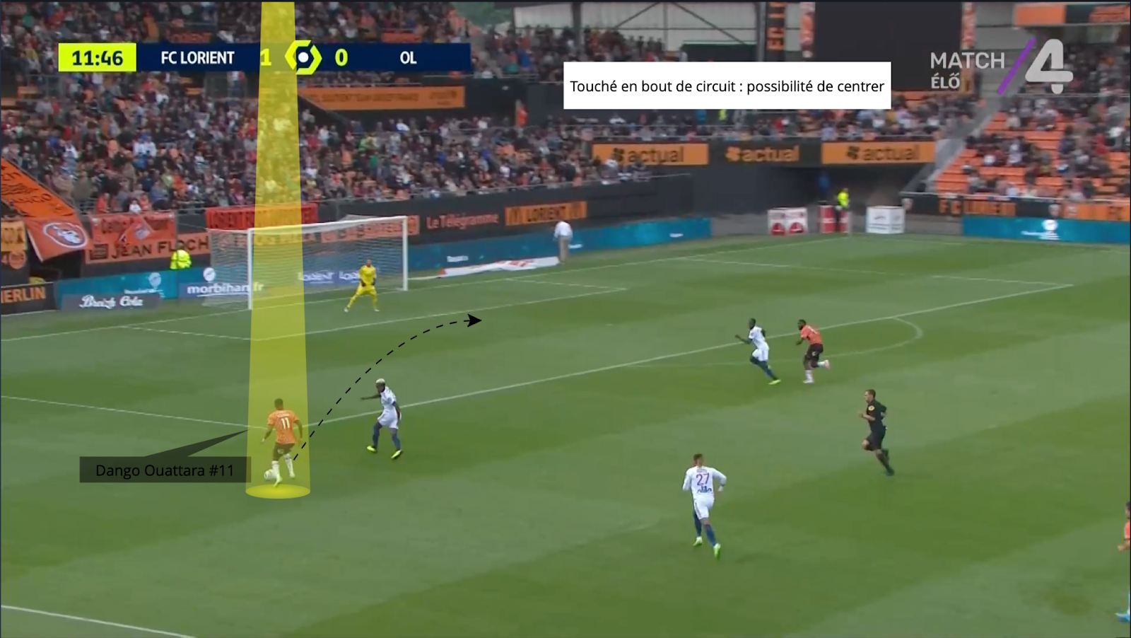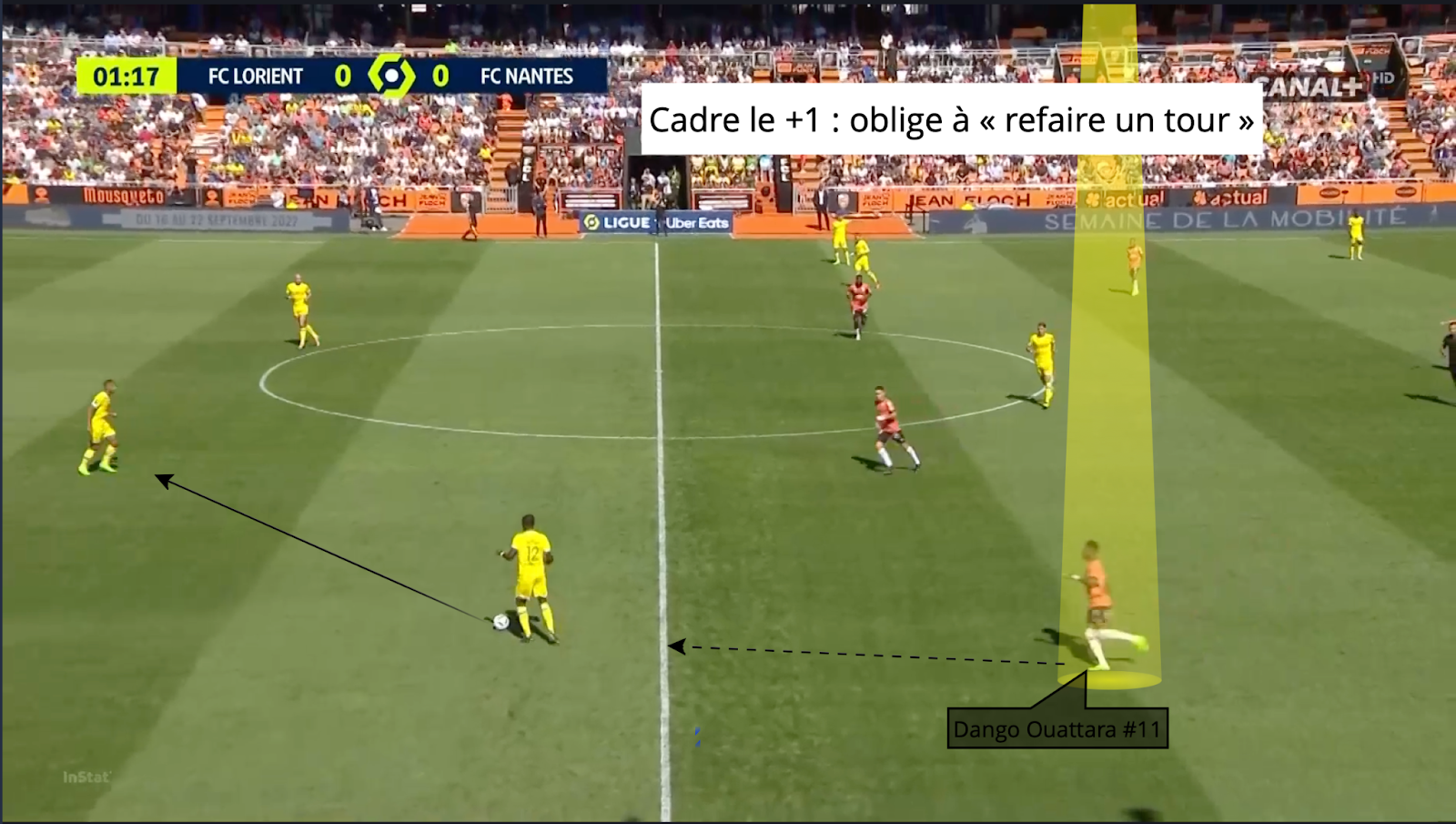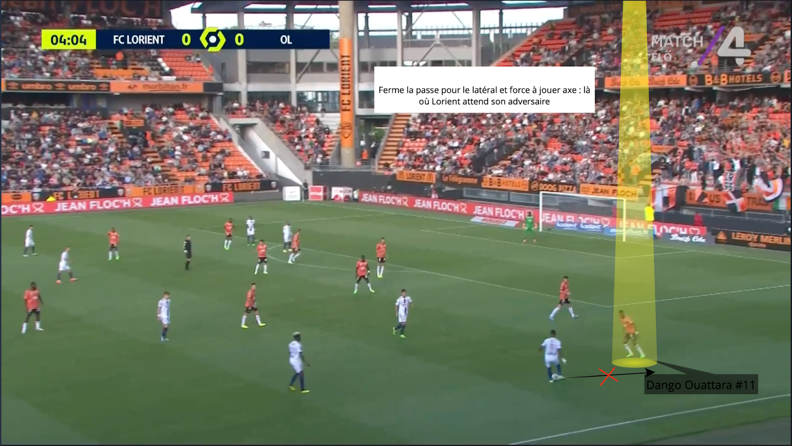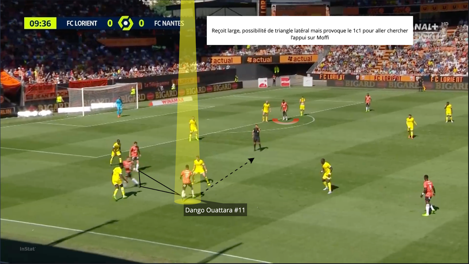 En esta situación, Dango Ouattara también es formidable. Más que su fina calidad de regate, es su explosión de velocidad y aceleración en los primeros 3 metros lo que marca aquí. El joven extremo de Lorient se adelanta muy rápido y lee muy bien los apoyos del oponente para atacarlo rápidamente cuando cambia la posición de su cuerpo. Tanto zurdos como diestros, la amenaza de meterse en el hueco es real, como hemos visto, lo que complica un poco más la tarea defensiva.