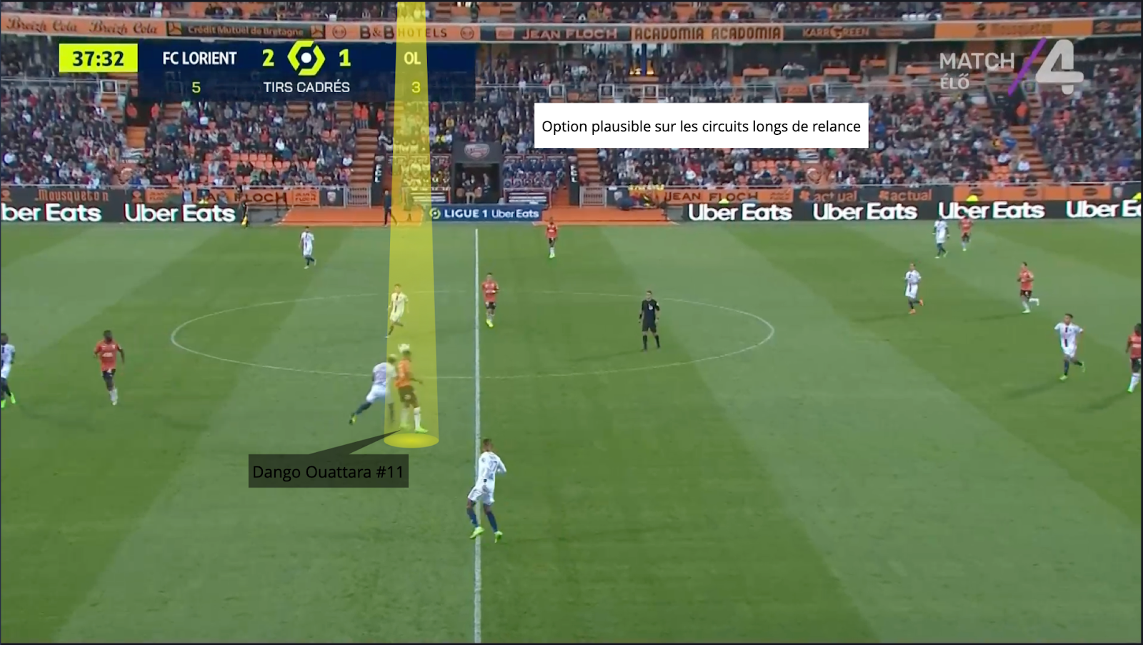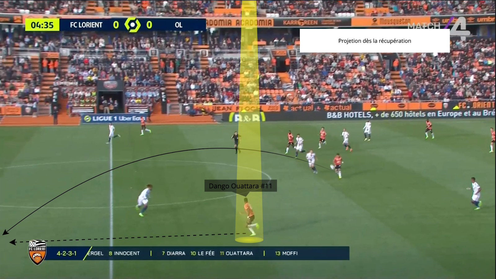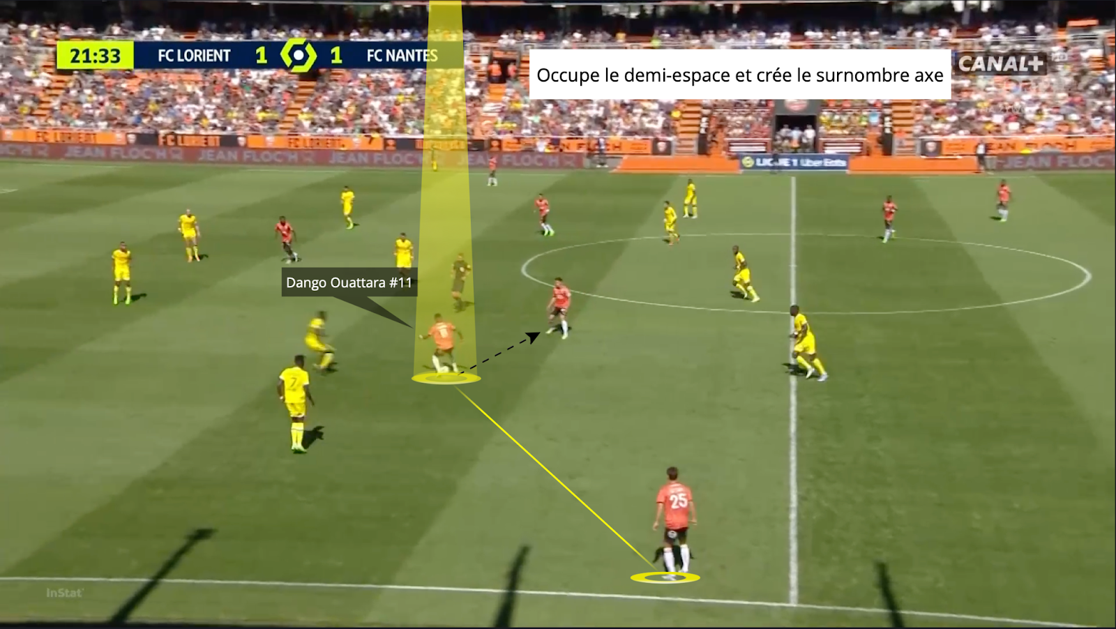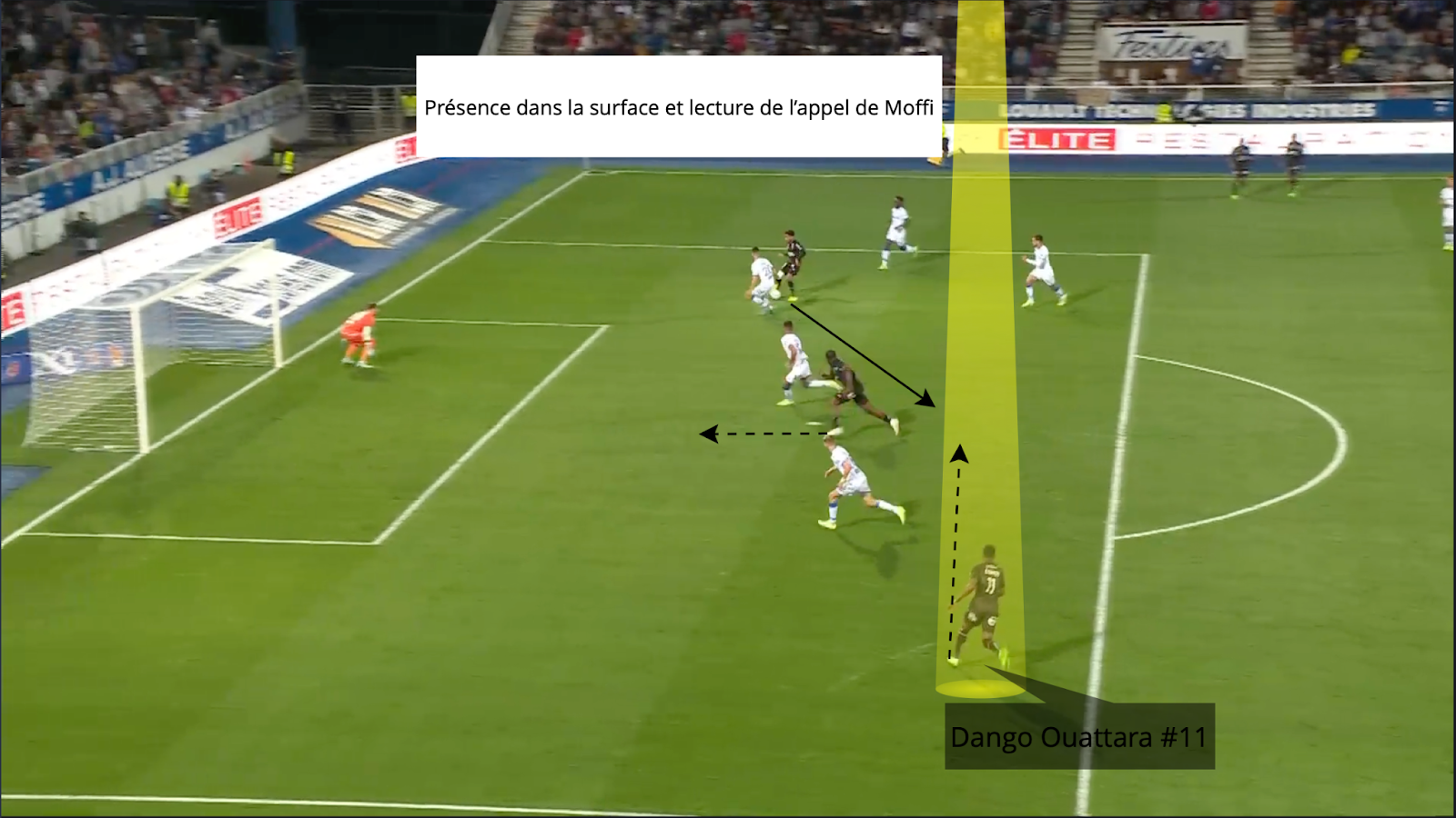 Tan pronto como el jugador contrario se acerca a la superficie, nada se deja al azar y el trabajo se realiza en conjunto con Terem Moffi. Este último se sumerge la mayor parte del tiempo en 5,50 m y la lectura de juego dango ouattara hecho que siempre pregunta en el espacio adecuado, en este caso detrás de su gol ante el AJ Auxerre. Los movimientos se coordinan alrededor de la superficie y 2 jugadores nunca terminan en la misma área.
