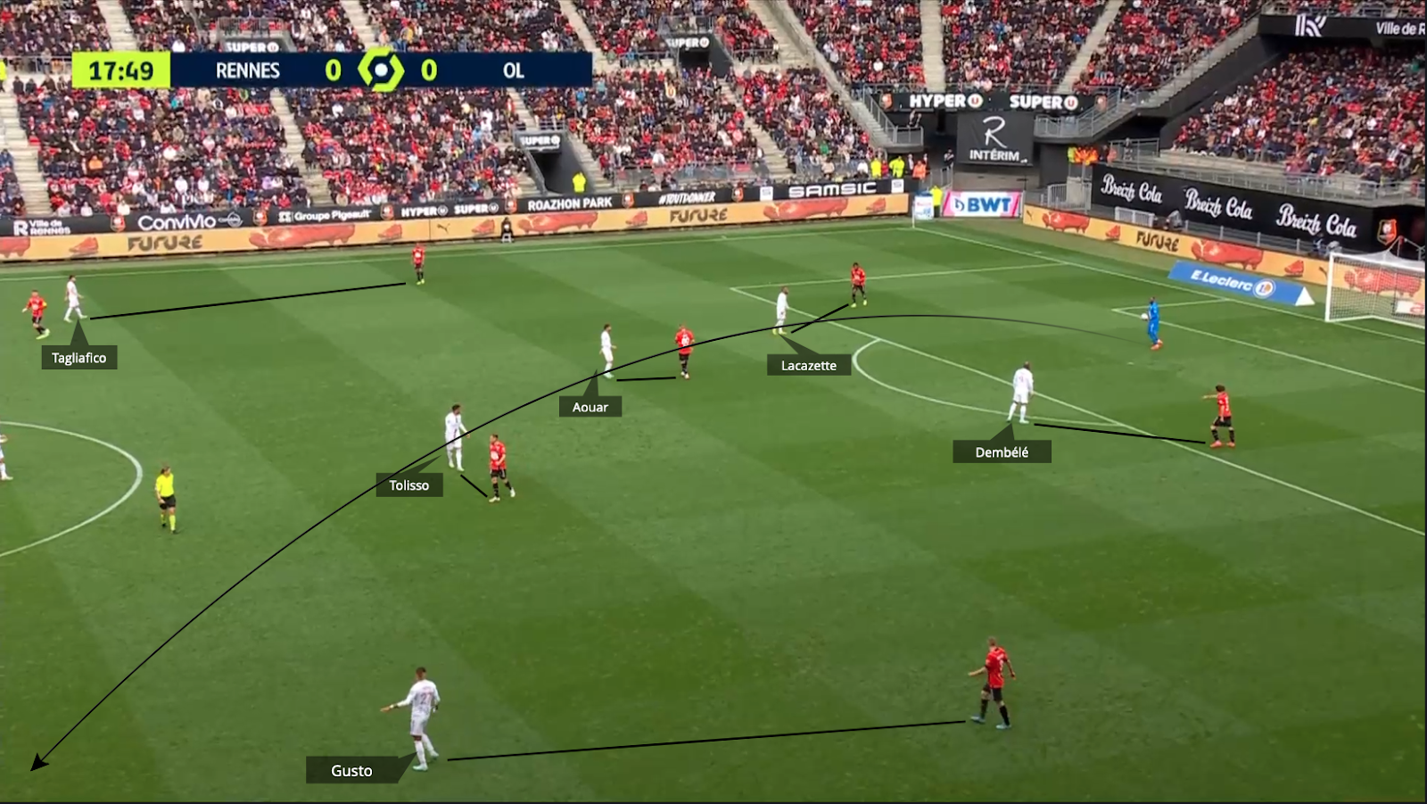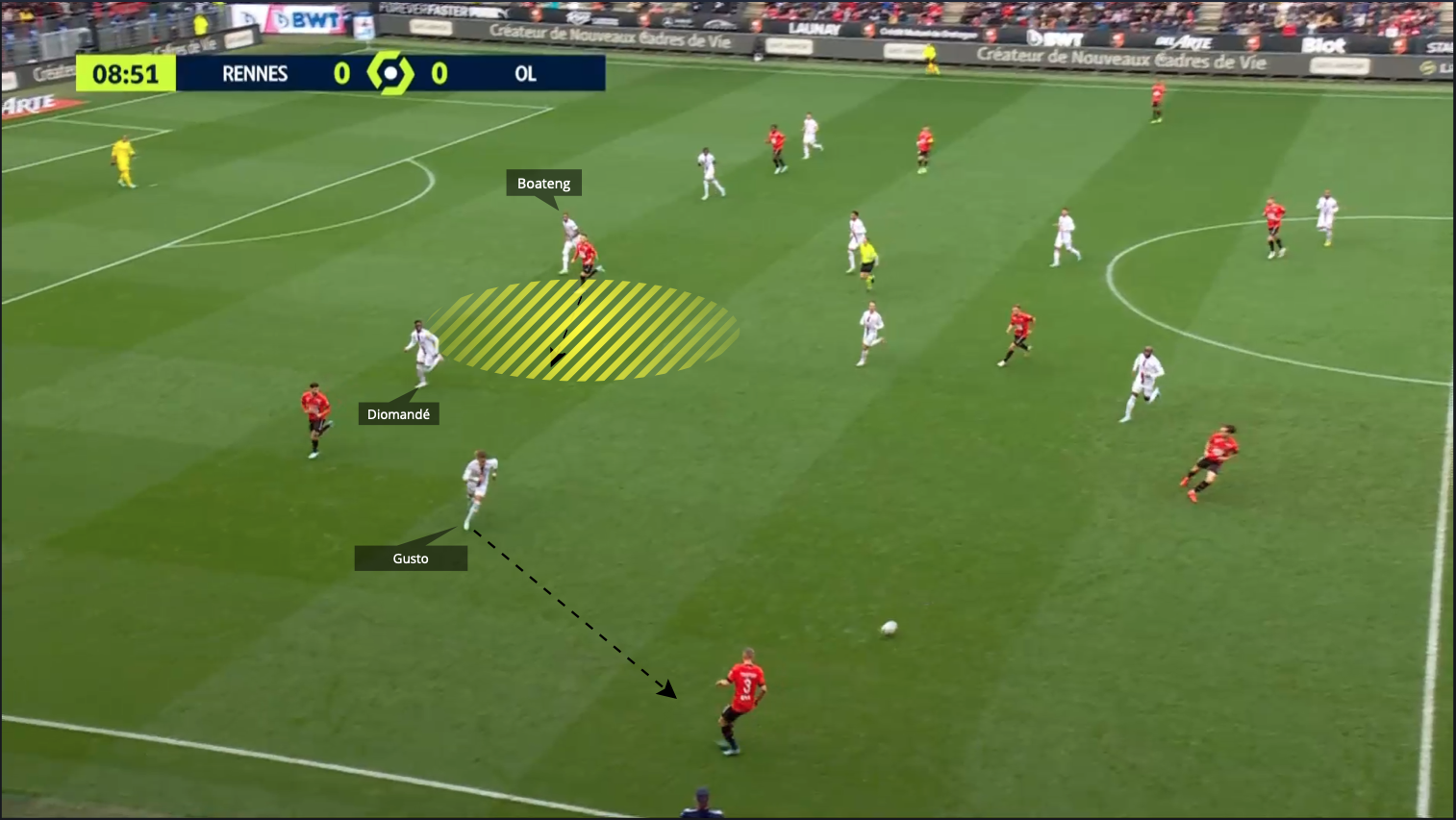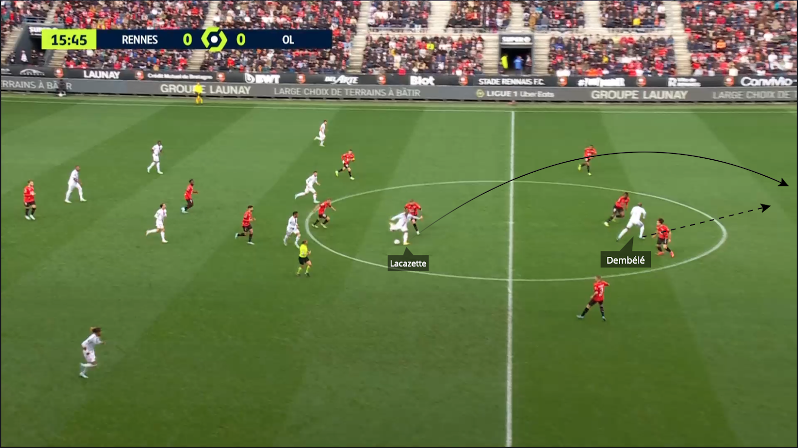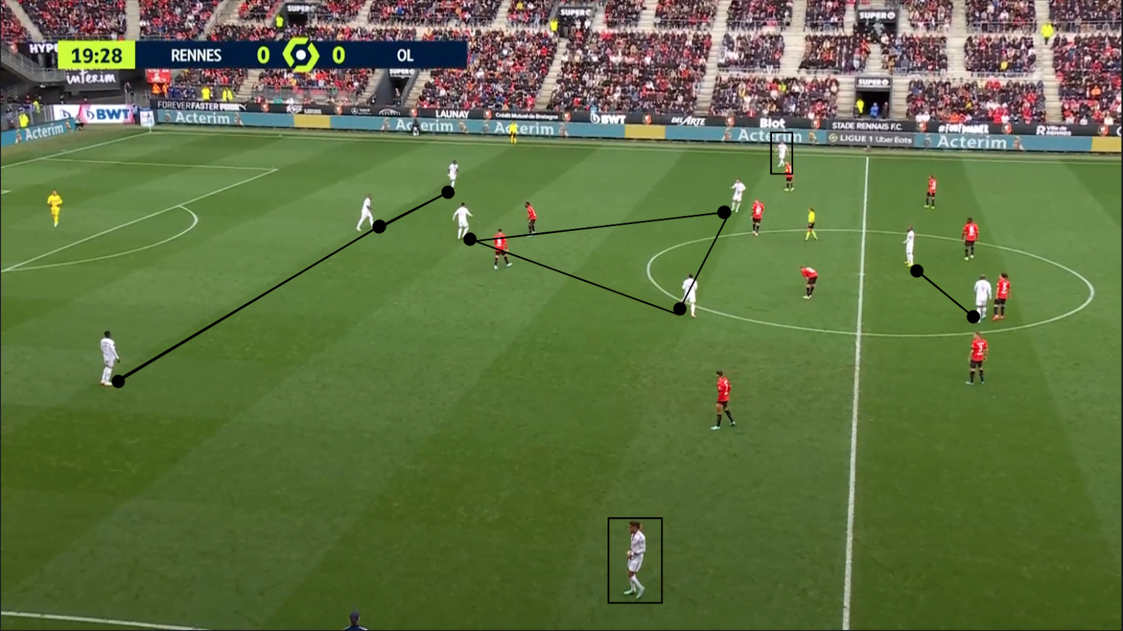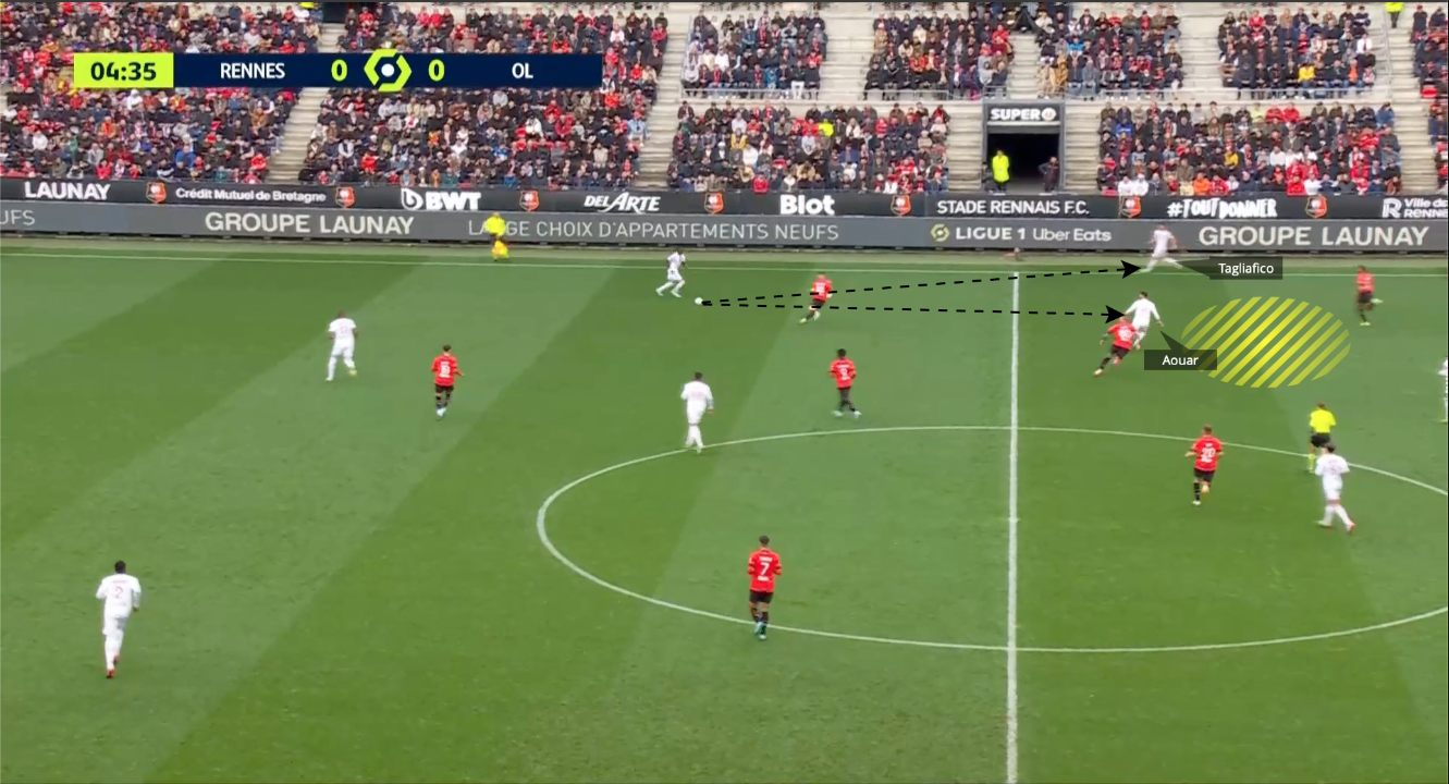 Con posesión de balón superior a la del Rennes, el Lyonnais jugaron poco en transición, pero cuando lo hicieron fue incisivo y directo. La relación entre los dos atacantes del Lyon volvió a destacarse.