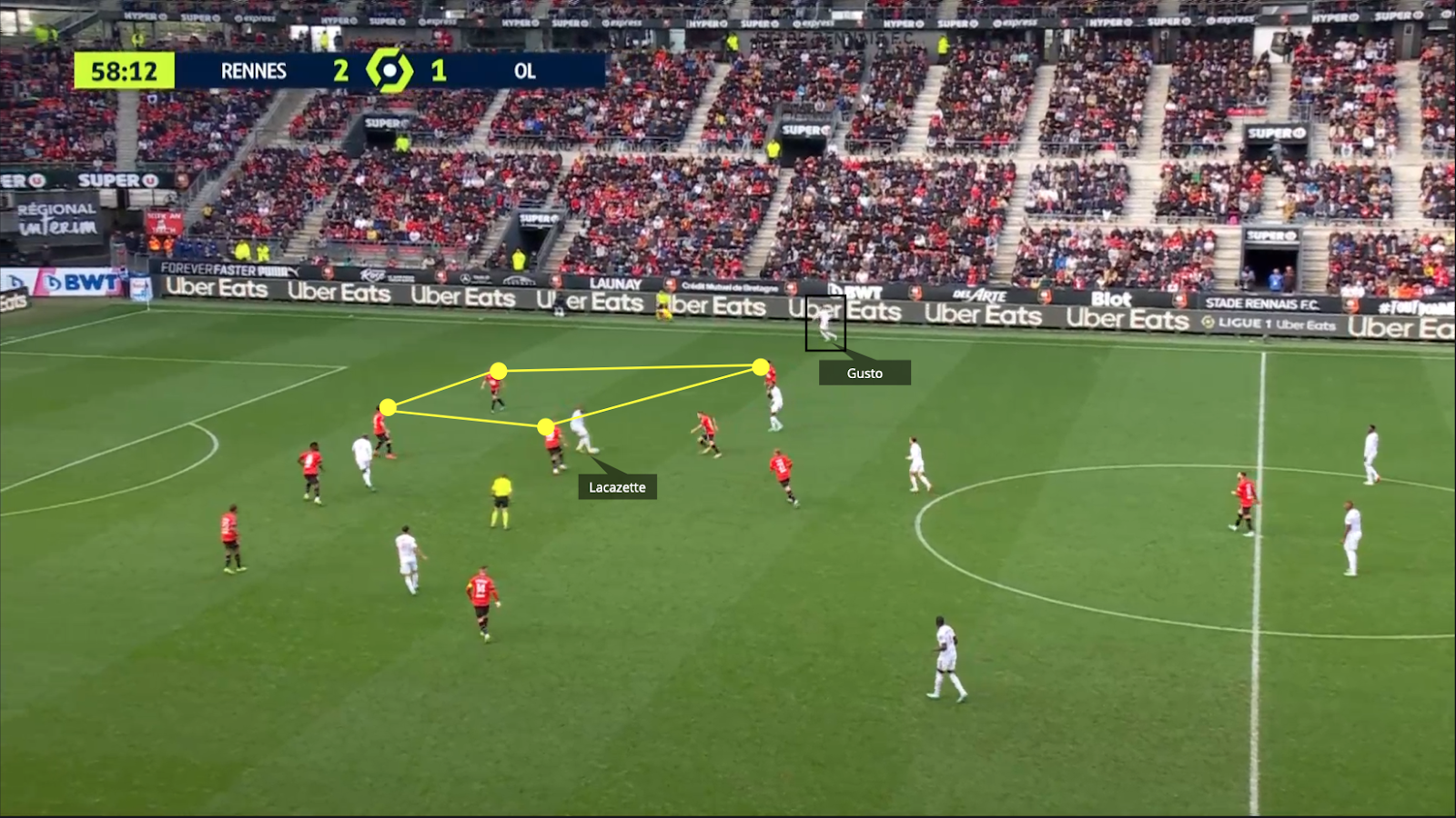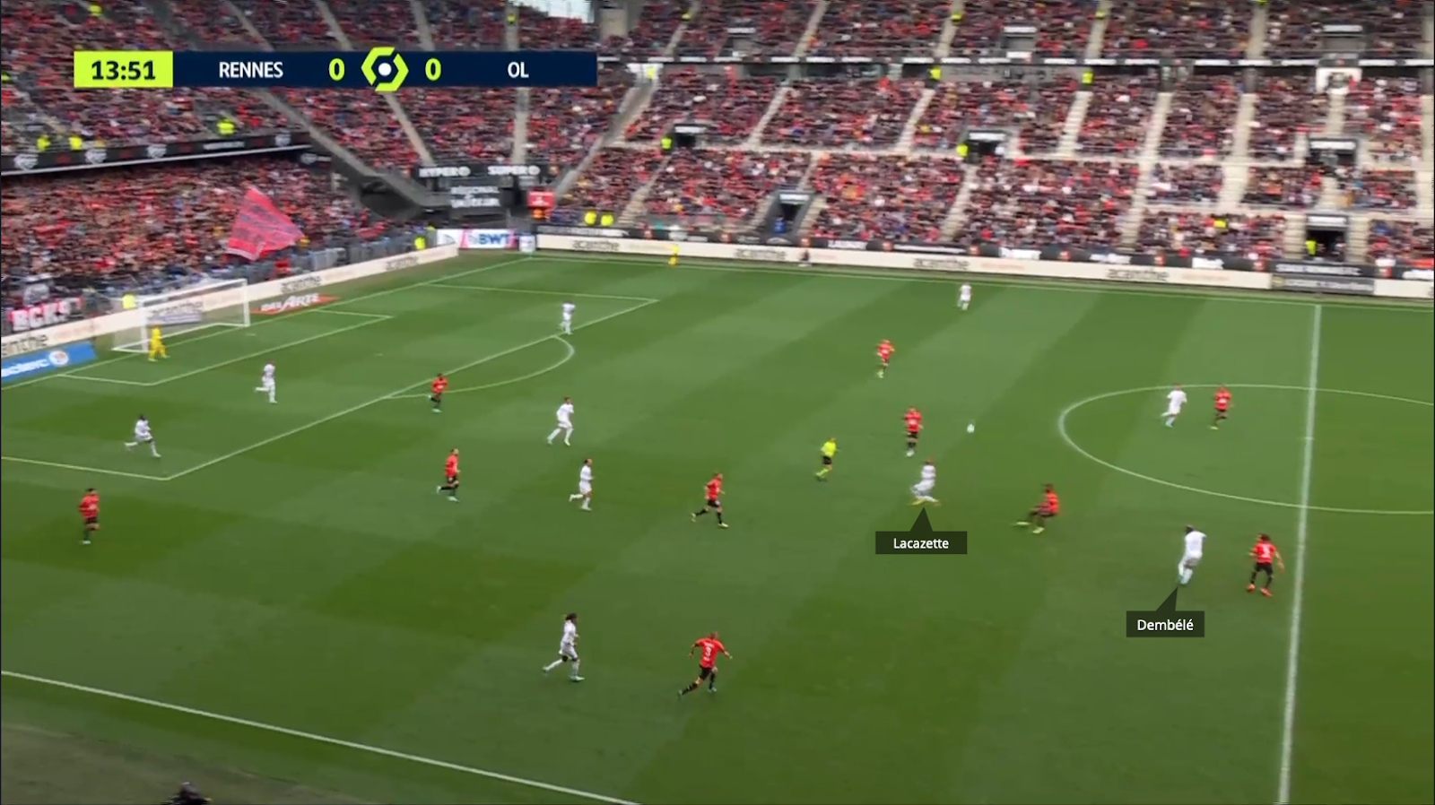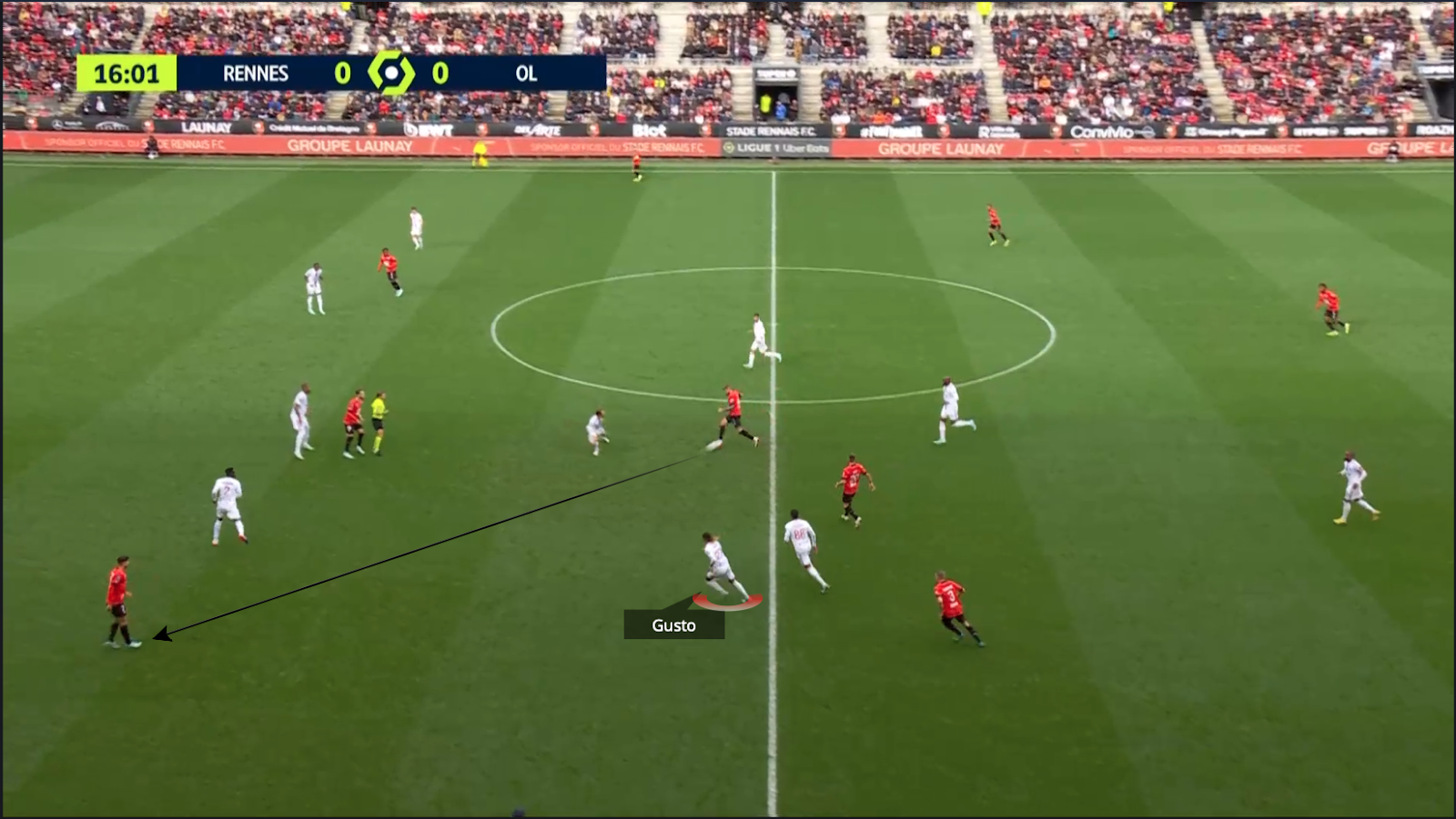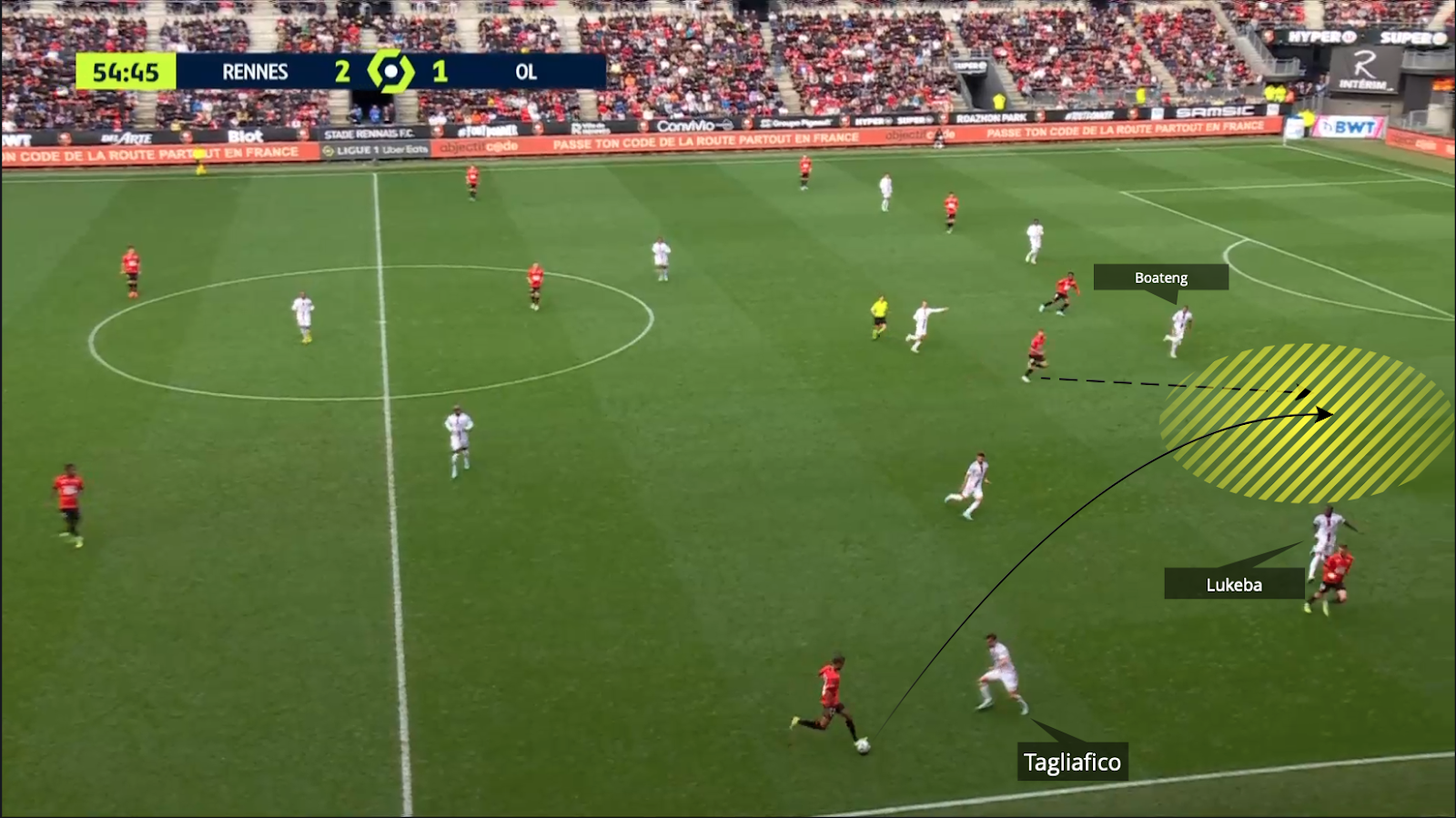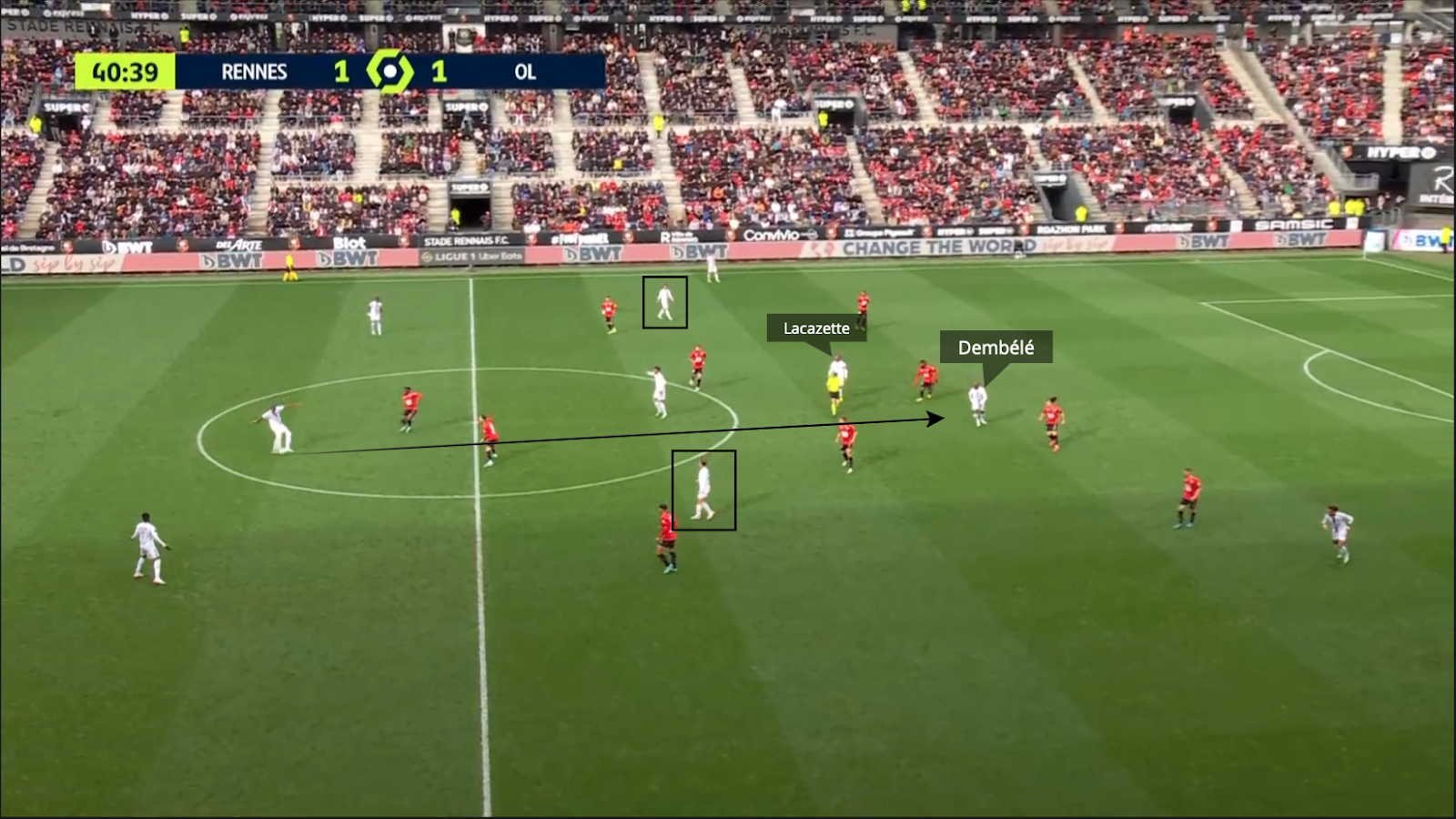 Con posesión de balón superior a la del Rennes, el Lyonnais jugaron poco en transición, pero cuando lo hicieron fue incisivo y directo. La relación entre los dos atacantes del Lyon volvió a destacarse.