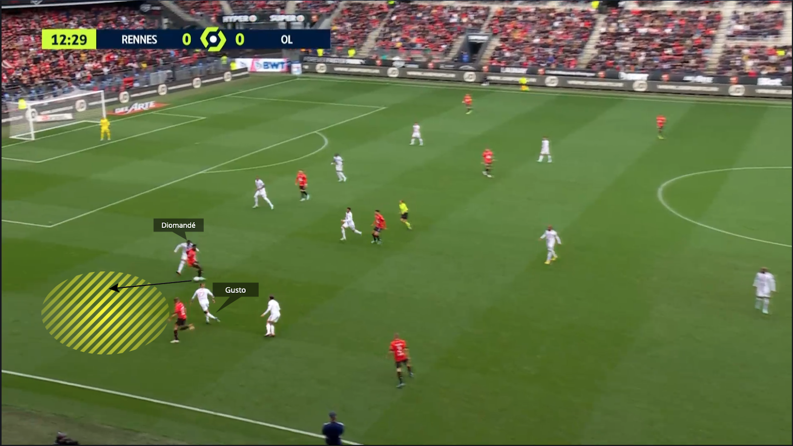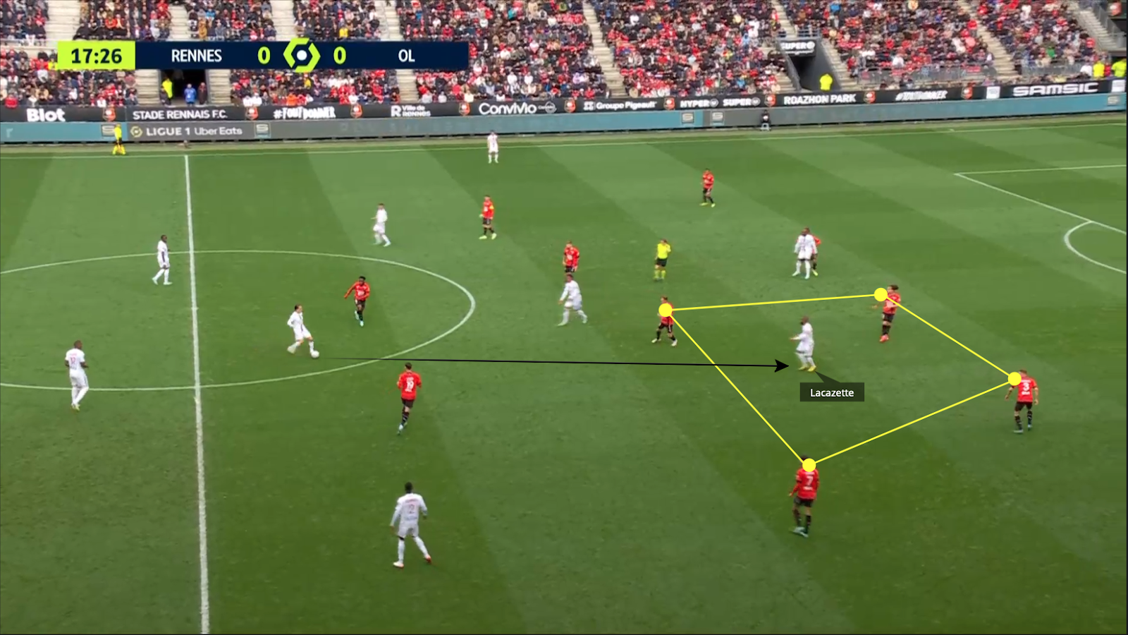 Con Maxence Caqueret y Houssem Aouar muy abiertos, los dos centrocampistas del eje Rennais se mueven muy fácilmente para apretarlos más cerca, lo que abrió el eje muchas veces.